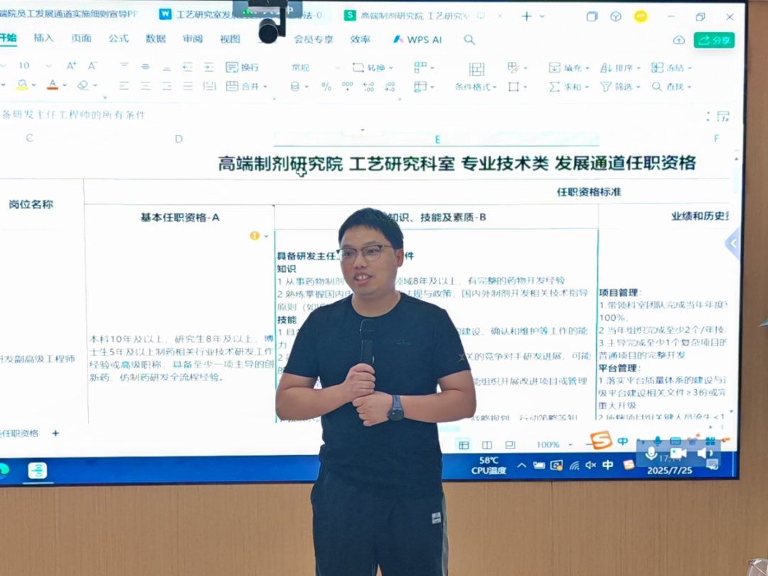 公司的发展离不开员工的成长,员工的成长路径如同精密的导航系统,指引着人才进阶的方向。7月25日,力捷迅“培练展” 项目第3期聚焦 “高端院员工发展通道之任职资格与评审办法”,为研发人才职业发展指引方向,旨在实现高端制剂研究院的可持续成长与发展。